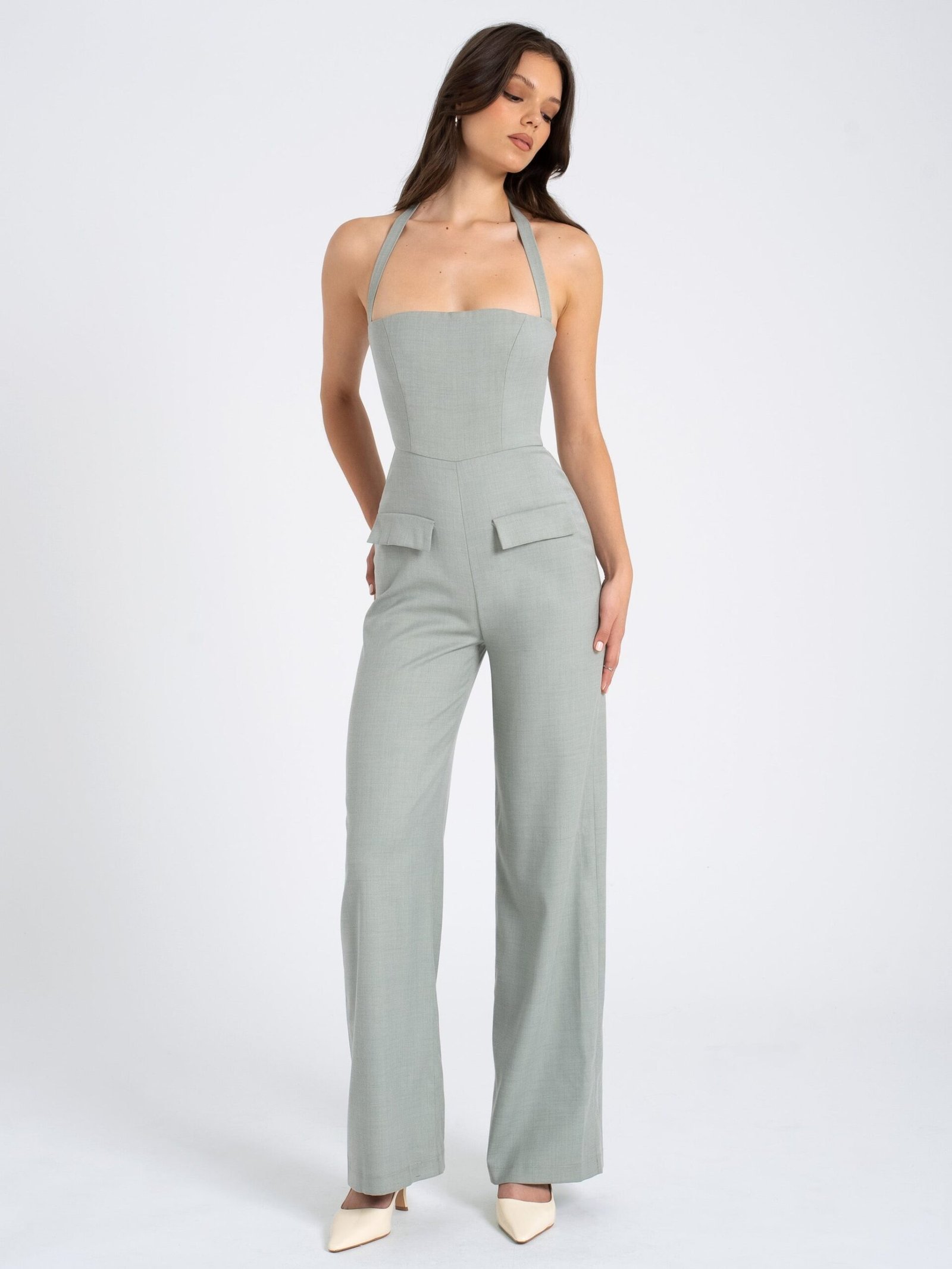 Step into effortless elegance with our Zaria jumpsuit! In a serene sage green, this jumpsuit features an adjustable halter neck for a customizable fit. The built-in corset ensures a flattering silhouette, while the wide-leg pants, adorned with faux pocket decorations, add a touch of playful sophistication. Finished with an invisible zipper at the back, this jumpsuit is perfect for any occasion, blending style and comfort seamlessly.